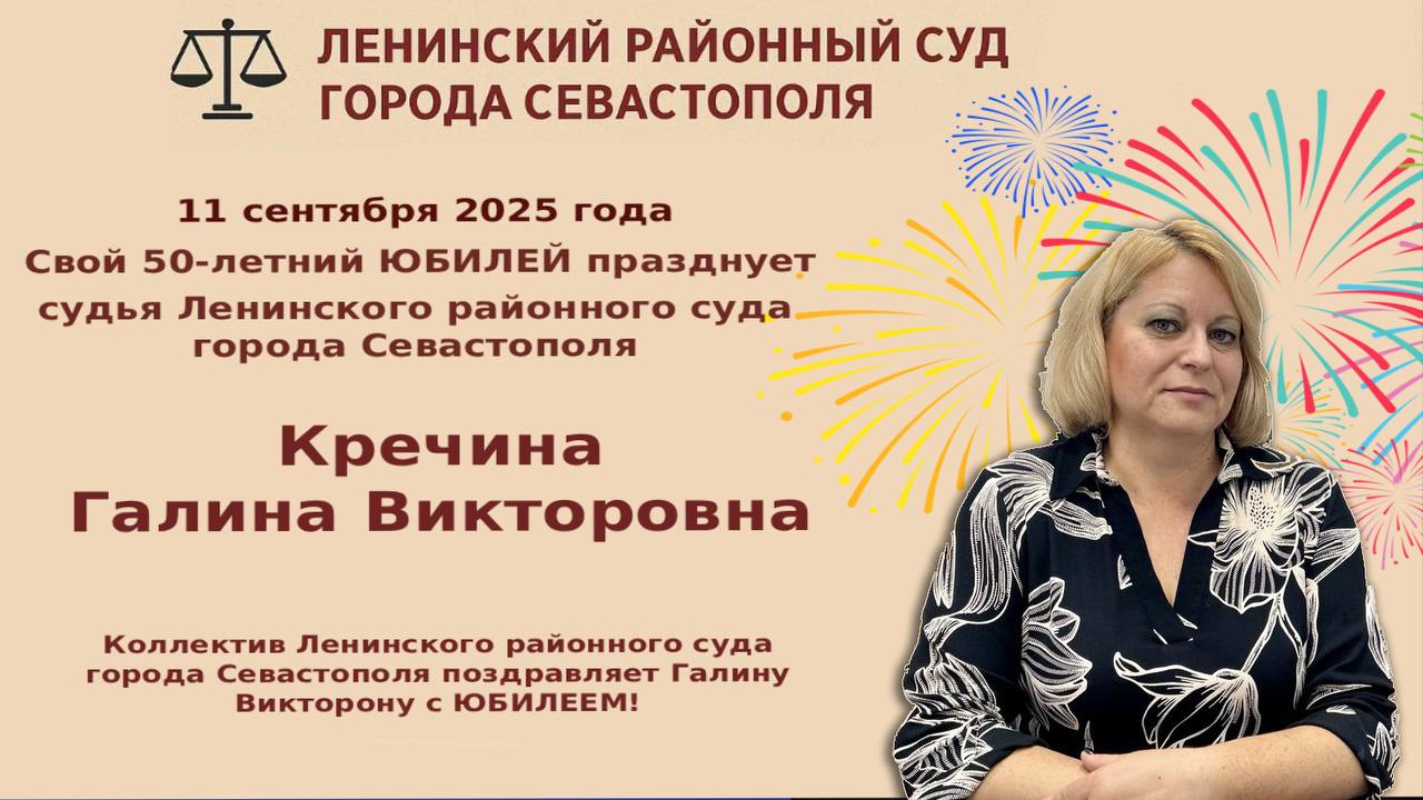 Ленинский районный суд города Севастополя поздравляет с юбилеем – 50-летием – судью Кречину Галину Викторовну!версия для печати