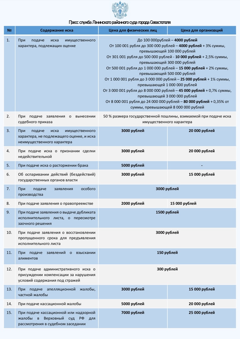 Сведения о размере и порядке уплаты государственной пошлины по категориям дел, подлежащих рассмотрению в суде